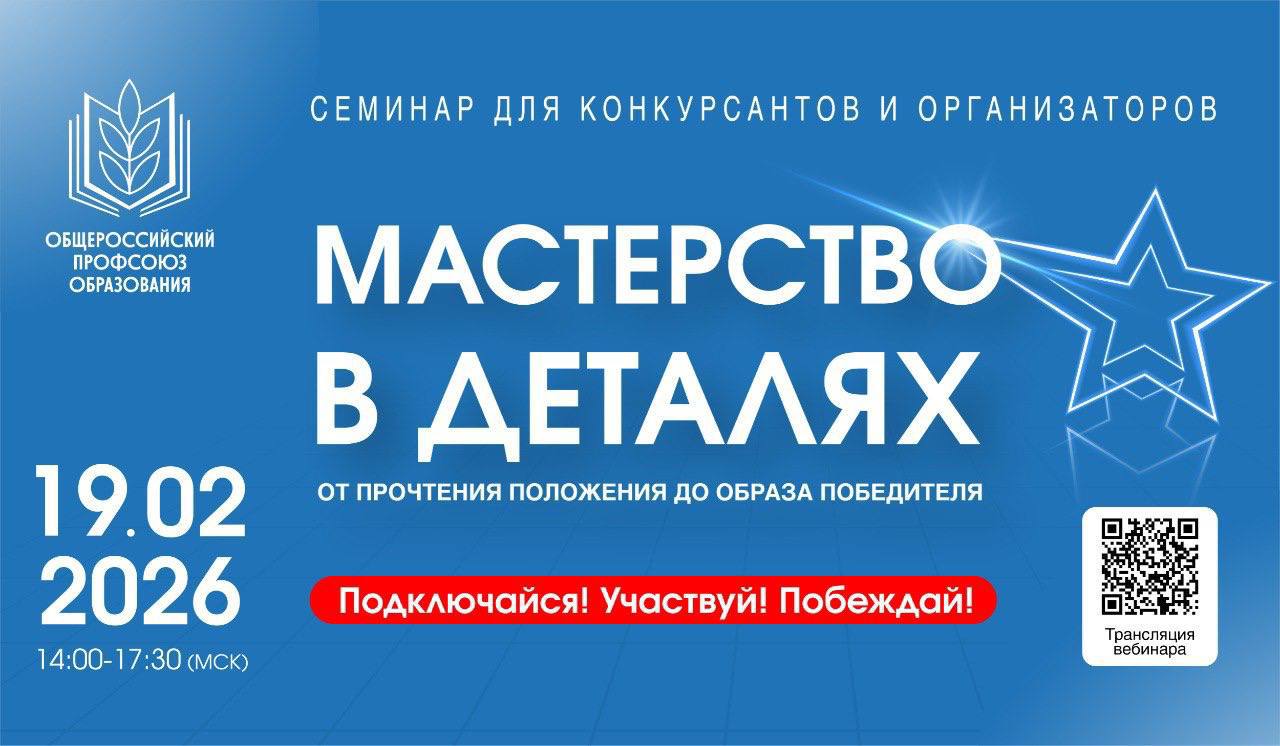 На вебинаре вы узнаете, как правильно готовиться к конкурсам и даже к отдельным испытаниям, как пройти непростой путь и что будет потом, как педагогов поддерживает Профсоюз - об этом расскажут участники и победители различных профессиональных состязаний, эксперты, члены жюри.