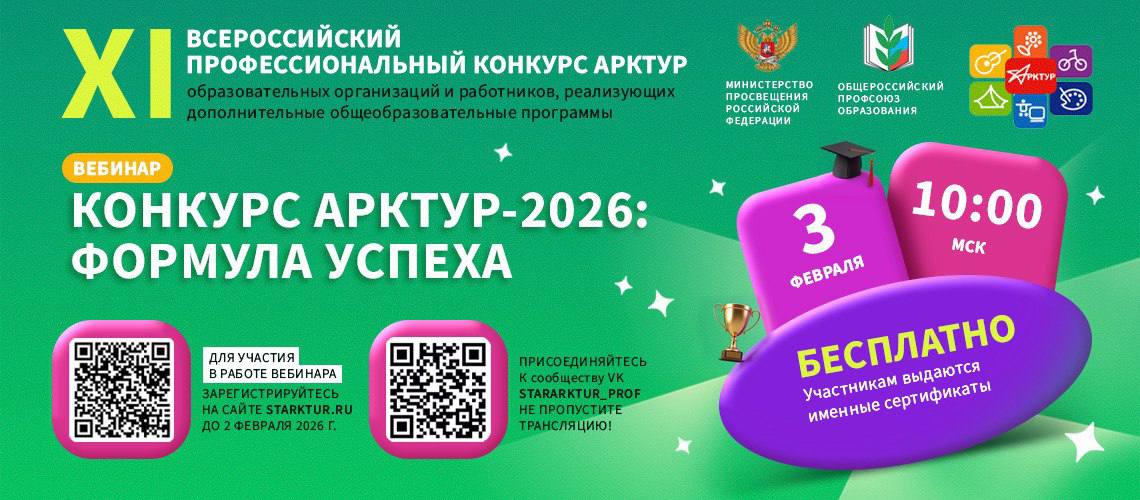 3 февраля с 10:00 (МСК) Профсоюз проводит вебинар «Формула успеха» для образовательных организаций и работников, реализующих дополнительные общеобразовательные программы — настоящих и будущих участников Всероссийского профессионального конкурса «Арктур». (https://vk.com/stararktur_prof)